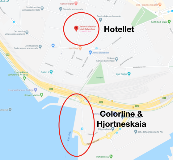 Booking.com pleier å ha gode priser på overnatting i dette hotellet. Da er også frokost og middag (kveldsmat) inkludert. Bildet under viser hvor hotellet ligger i forhold til Colorline og Hjortneskaia.