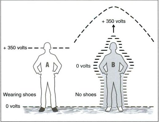 Hvis du står ute på en klar dag, iført sko eller står på et isolerende underlag (som et tre eller vinyl gulv), er det er en elektrisk ladning av ca. 350 volt mellom jorden og toppen av ditt hode (se personen med sko til venstre) hvis du er 1,75 m høy. Husk at det er 0 volt på bakkenivå.