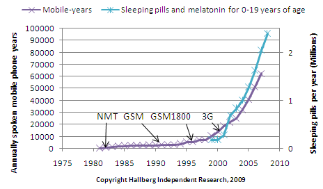Som den grafiske fremstillingen viser har bruk av sovemedisin økt dramatisk blant personer i alderen 0-19 år etter introduksjonen av 3G nettverk som igjen har økt mobil telefon bruk. Med 4G lansering og etterhvert 5G lansering kan vi bare anta at bildet vil se enda verre ut.