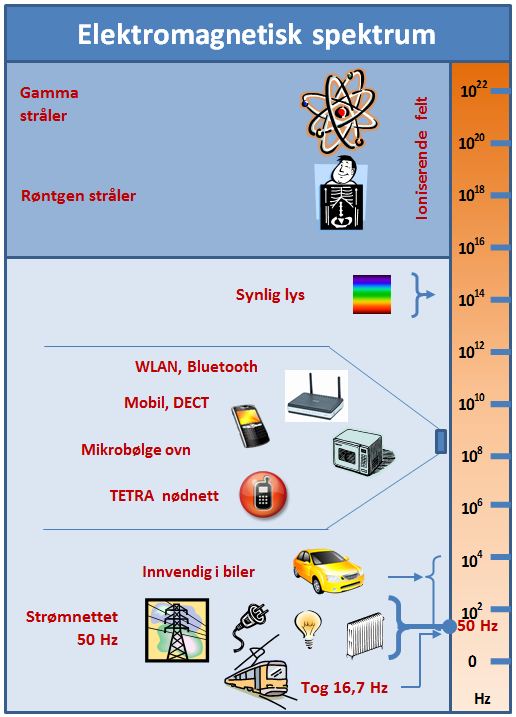Figuren under viser hele det elektromagnetiske spekteret - lavfrekvent og høyfrekvent. Bildet er hentet fra Ravnco.com som er godkjent av Forening for el-overfølsomme (FELO) for måling av stråling: