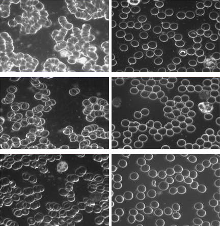Før-bildene er til venstre. Etter-bildene er på høyre side. Bildene viser at kun 40 minutter med jording gir en betydelig og dramatisk uttynning av blodcellene.